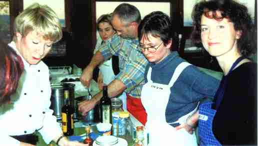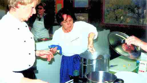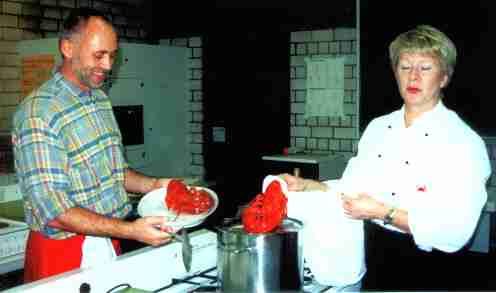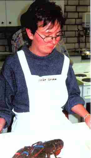 Die Hummer werden dann in stark kochendes Wasser, das mit einer sehr kräftigen Prise Meeressalz und einem Eßlöffel Kümmel versetzt ist, kopfüber eingetaucht. Sofort muß der Schwanz nachgedrückt werden. Das sollte sehr schnell gehen, damit das Tier nicht unnötig leidet. Eher in den Bereich der Ammenmärchen gehört wohl, daß die Hummer quitschen oder pfeifen würden, wenn sie das sprudelnde Wasser sehen. Jedenfalls hat keiner unserer Hummer auch nur einen Ton von sich gegeben.